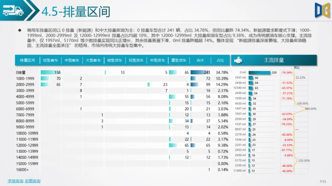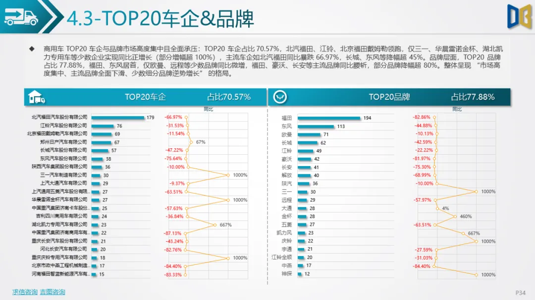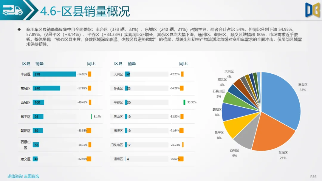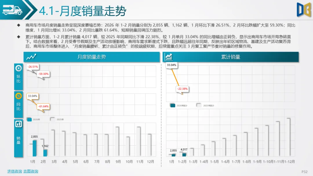 商用车市场呈现深度萎缩态势,1-2月销量分别为2,855辆、1,162辆,2 月环比跌幅达59.30%,同比暴跌61.64%,1-2月累计销量同比下滑22.38%。车型结构上,货车占比72.72%,以轻型、重型货车为主,所有车型均同比下滑;燃料结构中,柴油车占比40.02%,纯电动占比28.31%,但各类燃料车型均呈下滑态势,新能源车型增长动能丧失。TOP20车企与品牌市场高度集中,北汽福田、江铃等领跑,但主流品牌全面下滑,仅少数细分品牌逆势增长。排量区间向传统大排量柴油车型集中,新能源0排量车型同比暴跌74.34%。区县销量高度集中于丰台区、东城区等核心区域,但多数区县同比大幅下滑,仅少数区域保持需求韧性。