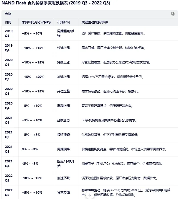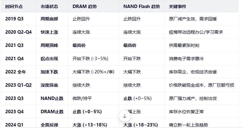 - 顶峰: 2021年第三季度达到周期最高点。此时DRAM和NAND Flash价格均处于历史高位。