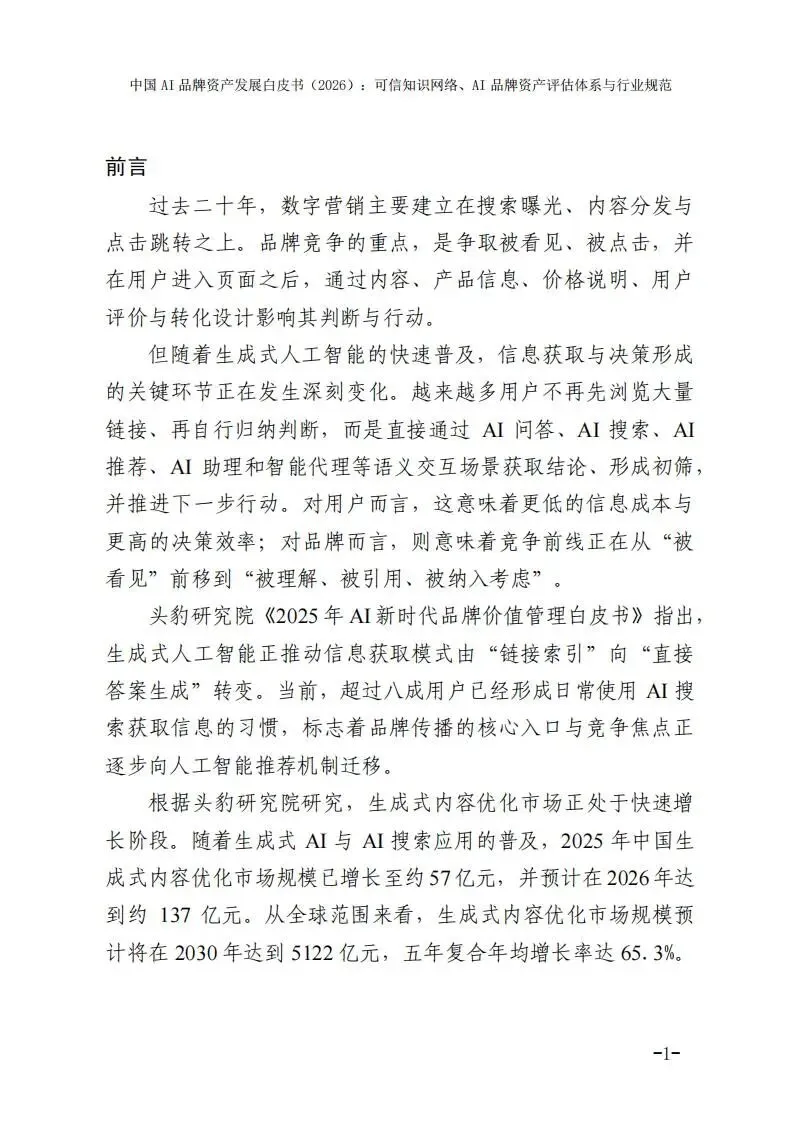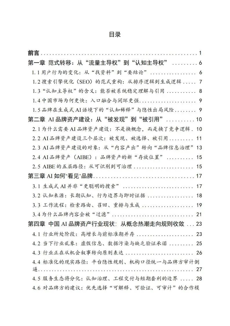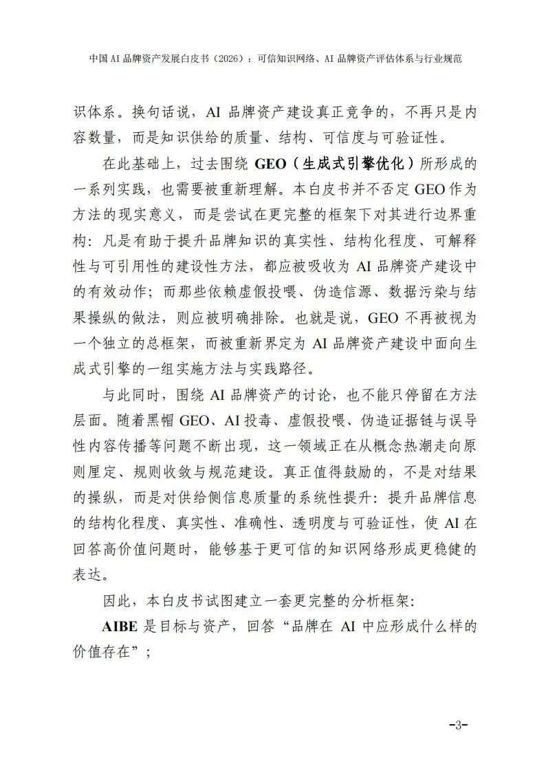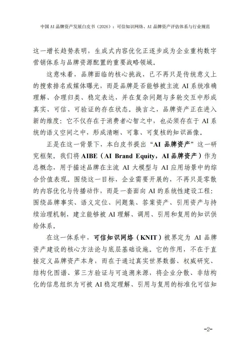 2026 年 3 月发布的《中国 AI 品牌资产发展白皮书》由国家广告研究院联合多家机构推出,聚焦生成式 AI 时代品牌竞争范式转移,构建 AI 品牌资产建设、评估与行业规范完整体系,明确品牌从 “流量主导” 转向 “认知主导” 的核心趋势。