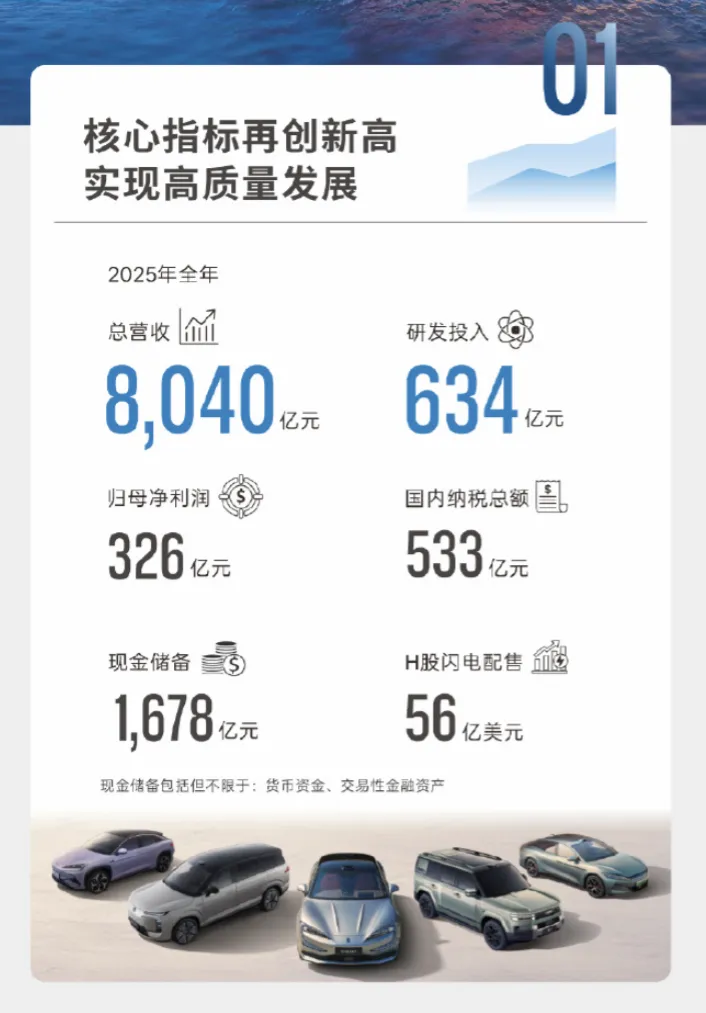 财报显示,2025年比亚迪实现营业收入约8039.65亿元,同比增长3.46%,再创历史新高。归属于上市公司股东的净利润达到326.19亿元。