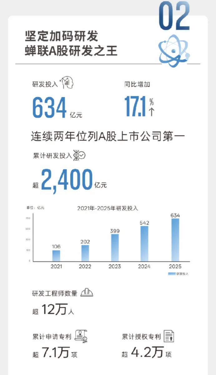 2025年,公司研发投入高达634亿元,同比增长17%,占营收比例约7.9%。这一数字不仅超过了其当年的净利润,也再次蝉联A股“研发之王”。