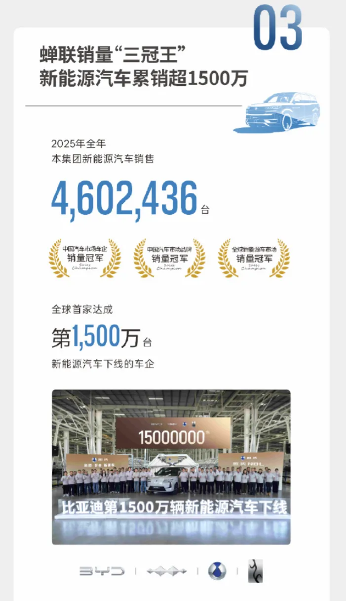 尽管面临激烈的价格战,比亚迪依然稳坐全球新能源汽车销量冠军的宝座。2025年,其全年销量达到460.24万辆,首次跻身全球车企集团销量前五。