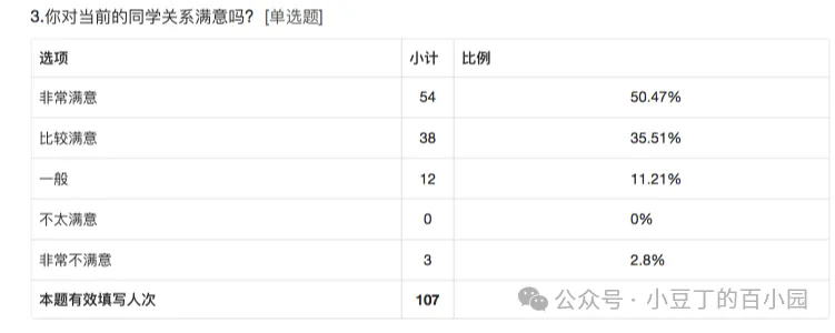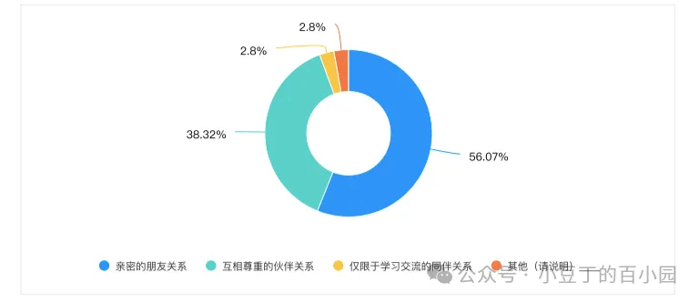 2、在期望的同学关系类型方面,超过半数(56.07%)的同学希望与同学建立亲密的朋友关系,说明同学们在同学关系上有较深的情感需求,不满足于仅仅是学习交流或互相尊重的表面关系。