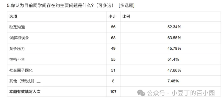 3、在同学间存在的主要问题方面,调查显示,同学们认为存在误解和误会(63.55%)以及性格不合(51.4%)的比例较高,这可能是影响同学关系进一步发展或导致小部分同学关系不和谐的重要因素。此外,缺乏沟通、有竞争压力、社交圈子固化等问题也有相当比例的同学选择,表明同学关系中的问题是多方面的。