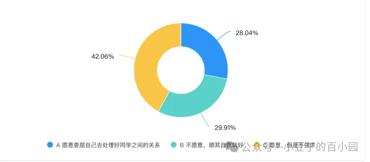 4、在改善维护同学关系的意愿,态度较为多元。约42.06%的同学选择了:愿意但不强求,29.91%的同学选择了不愿意,顺其自然就好。值得注意的是,竟然有高达28.04%愿意委屈自己处理好关系,建议大家对这个现象进一步讨论。