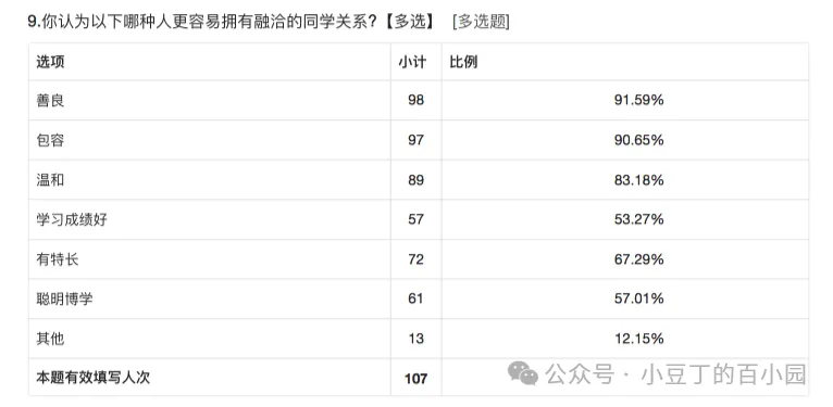 5、对于容易拥有融洽关系的人群特质方面,品德因素占绝对主流。绝大多数同学认为善良(91.59%)、包容(90.65%)、温和(83.18%)的人更容易拥有融洽的同学关系,说明品德和性格在同学关系中的重要性。仍有不少同学认为学习成绩好(53.27%)、有特长(67.29%)、聪明博学(57.01%)等因素有助于拥有融洽的同学关系,还有少数同学补充提出,幽默、真诚的人也容易拥有融洽的同学关系。