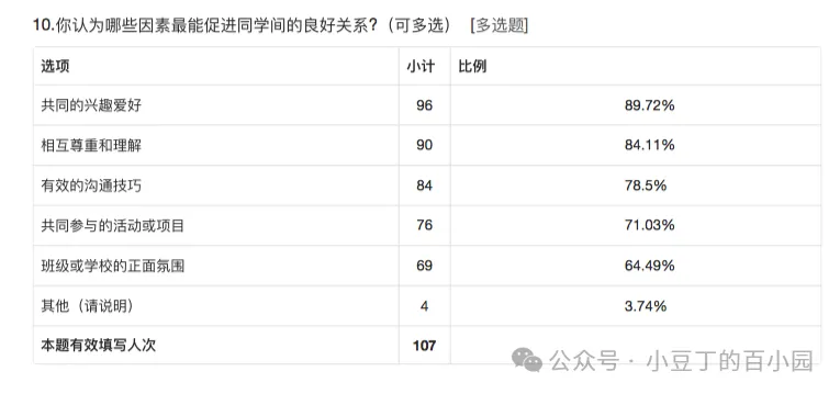 6、在促进同学良好关系的因素方面,绝大多数同学认为共同的兴趣爱好(89.72%)和相互尊重和理解(84.11%)是最能促进同学间良好关系的因素,紧随其后的是有效的沟通技巧(78.5%),共同参与的活动或项目(71.03%),班级或学校的正面氛围(64.49%),这为改善和促进同学关系提供了方向。