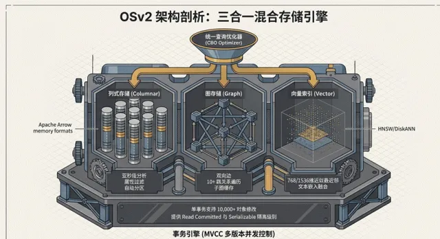 传统的企业架构中,往往需要 Neo4j 负责图遍历,Snowflake 负责列式分析。这种分裂导致了数据搬运的巨大开销。OSv2 通过**“三合一”模型**彻底化解了这一矛盾: