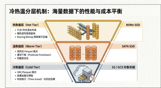 热数据层 (Hot Tier) :存放于NVMe SSD ,采用行式与列式的混合布局,并配合Roaring Bitmap索引压缩技术,确保高并发下的点查性能。