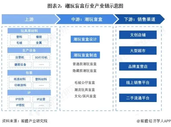 潮玩盲盒产业链涵盖上游、中游与下游环节。上游涉及玩具原材料(如塑料、橡胶、毛绒、金属等)、生产设备(如注塑机、3D打印机、搪胶设备等)、包装(如纸质、塑料材料及印刷涂料)以及IP(含创作、运营、授权等);中游聚焦潮玩盲盒设计与制造,制造包含普通款、隐藏款潮玩盲盒,还有毛绒公仔、潮流玩具、文化/国风等类型盲盒;下游则是多样销售渠道,有文创店铺、大型超市、品牌直营店、线上销售平台以及二手流通平台,各环节协同构建潮玩盲盒产业生态。