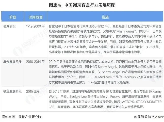 中国盲盒行业受经济、政策、社会环境等因素影响,发展至今,共经历萌芽阶段、缓慢发展阶段、快速发展阶段三个阶段。