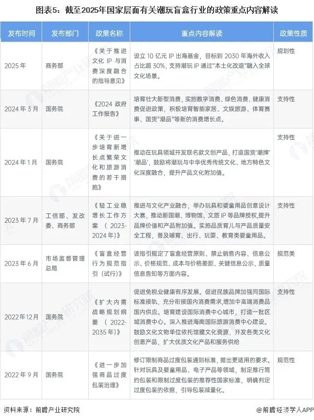 当前潮玩盲盒、玩具及潮玩IP的政策发展呈现“规范与创新并重、本土与国际联动”的格局。国家层面以2023年《盲盒经营行为规范指引(试行)》为核心,构建起覆盖全产业链的监管框架,明确禁止销售违禁品、强制公示关键信息、强化未成年人保护并将知识产权保护延伸至全行业。在文化赋能方面,政策鼓励“潮玩+非遗”“潮玩+文旅”融合,如东莞推出“千角灯”“醒狮”主题潮玩,同时设立10亿元IP出海基金,支持泡泡玛特LABUBU系列等通过本土化改造进入法国、泰国市场,目标2030年海外收入占比超30%。