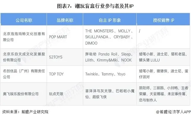 当前潮玩盲盒主要的供应品牌有泡泡玛特、52TOYS、TOP TOY等。公司在潮玩盲盒领域各有布局,泡泡玛特专注自主IP如THE MONSTERS等;52TOYS兼具自有IP与蜡笔小新等授权IP;TOP TOY有Twinkle等自主IP及多个授权IP;奥飞娱乐以自有经典IP为主,也有阴阳师等授权IP。