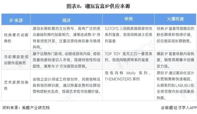 三种IP来源各有优势——经典IP依托文化沉淀,爆款IP借力内容热度,原创IP凭借设计创新。品牌需根据市场需求灵活组合,例如泡泡玛特通过“自有IP+联名”策略实现营收多元化,而52TOYS则以授权IP为核心巩固细分市场。