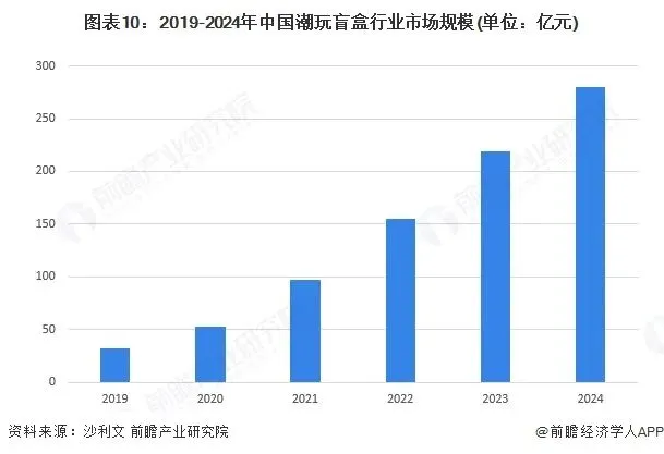 潮玩本身为舶来品,注重艺术+收藏属性,IP为差异化核心,早期中国香港、日本、欧美市场主导,根据沙利文数据,2021年中国潮玩盲盒市场规模约为97亿元,结合近年来代表性企业的经营情况,初步测算2024年中国潮玩盲盒行业市场规模约为280亿元。