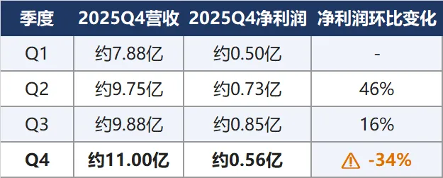 Q4营收是全年最高的11亿元,占全年营收的29.3%,但净利润只有0.56亿,占全年不到20%。也就是说,四季度旺季增收,反而减利了!