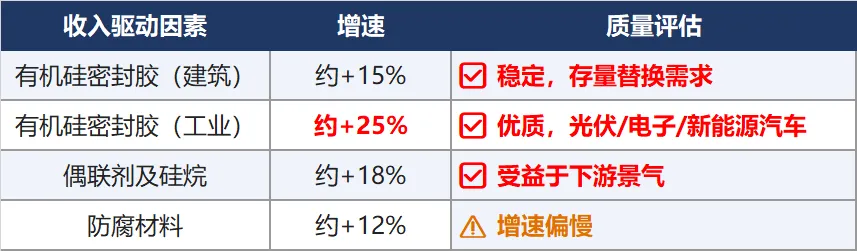 最大的亮点是工业用有机硅密封胶增速达25%,远高于建筑用胶的15%。
