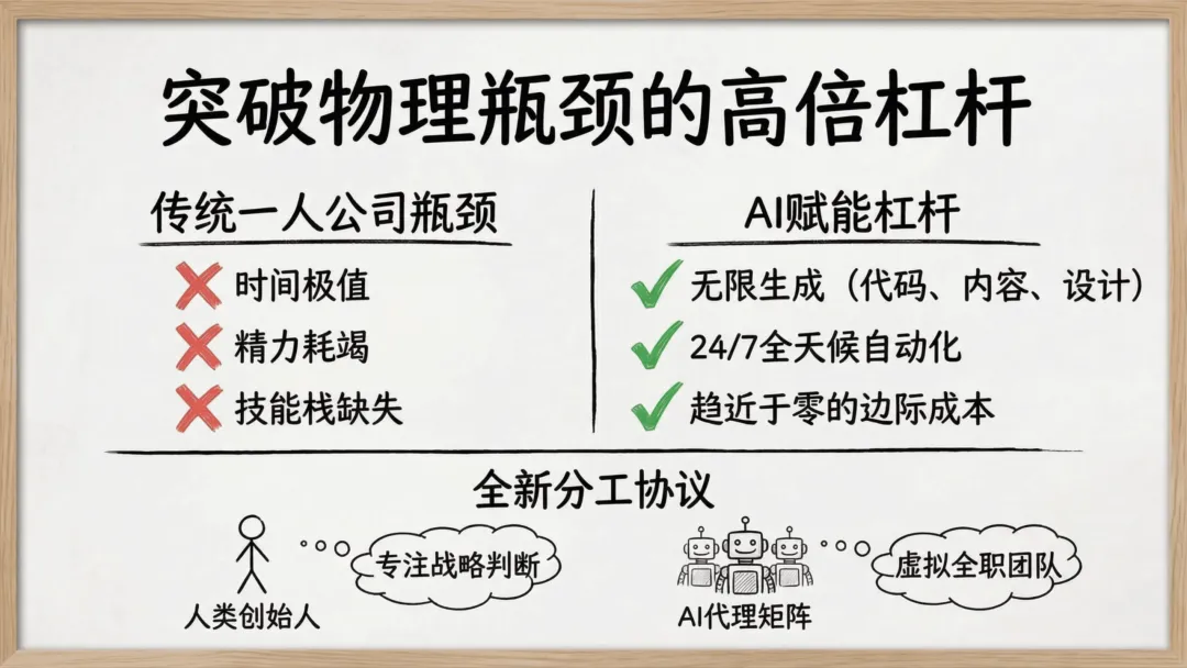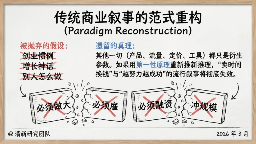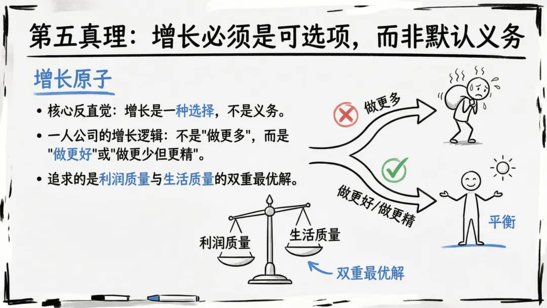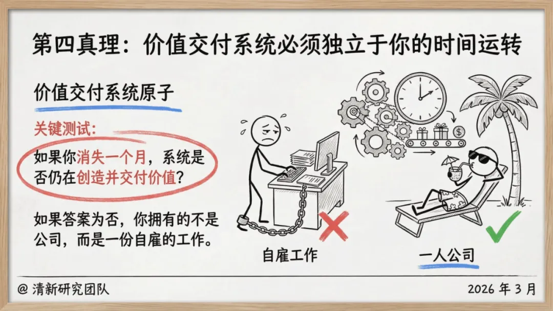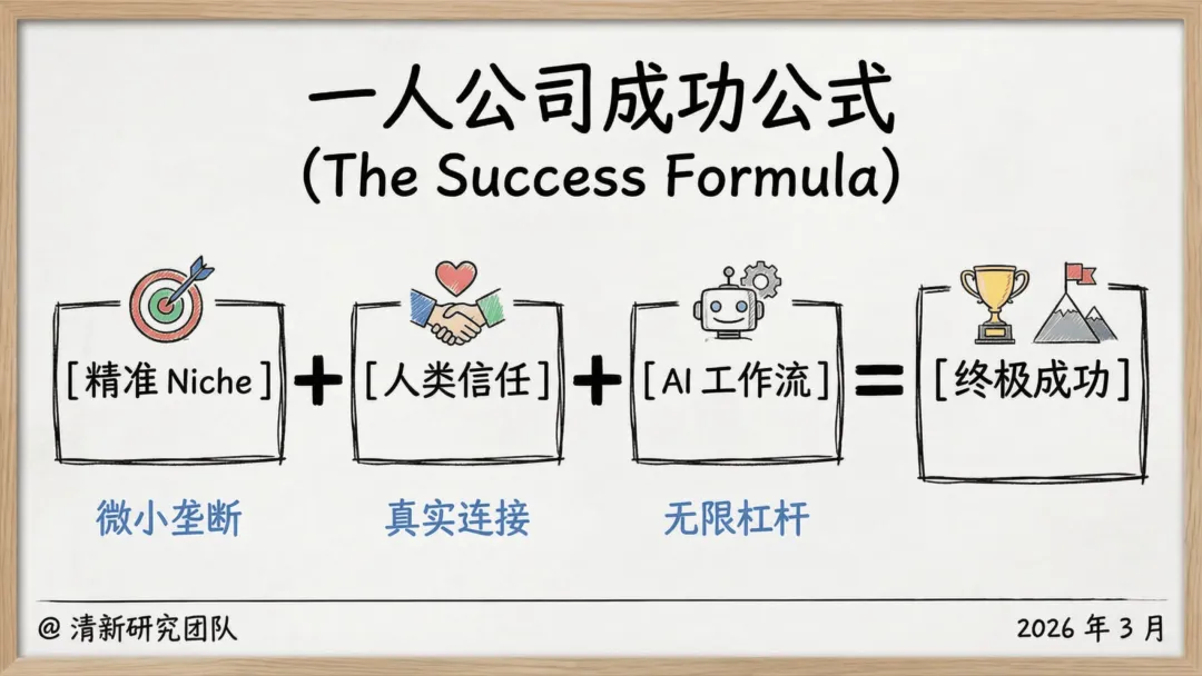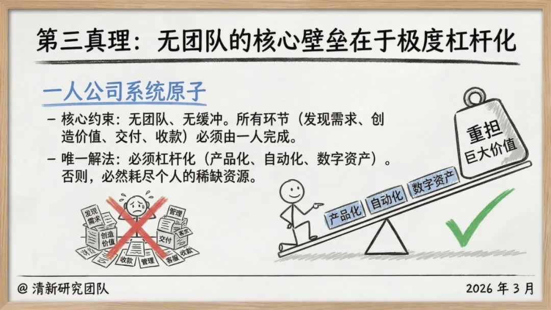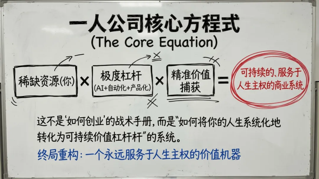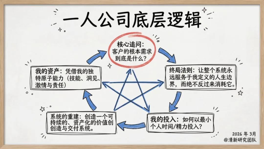 这份报告的核心,是打破 “必须做大、必须雇人、必须融资” 的创业惯性,重构以 “人生主权” 为核心的商业逻辑 —— 让公司成为服务生活的工具,而非消耗生活的枷锁。从底层真理到实践蓝图,从风险防控到趋势预判,每一个维度都为想做一人公司的创业者,提供了可落地、可复制的答案。