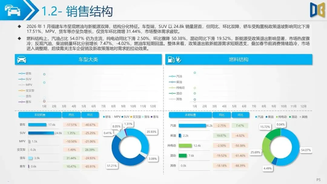 2026 年 1 月福建汽车市场开局呈现 “高位回调、结构稳固” 的态势。单月销量 48.4k,环比暴跌 32.37%,主要受春节假期效应冲击,终端成交节奏显著放缓;但同比仅微跌 5.00%,累计维度保持 - 5.00% 的温和收缩,展现出强于全国平均水平的消费韧性与市场基本盘的稳定性。