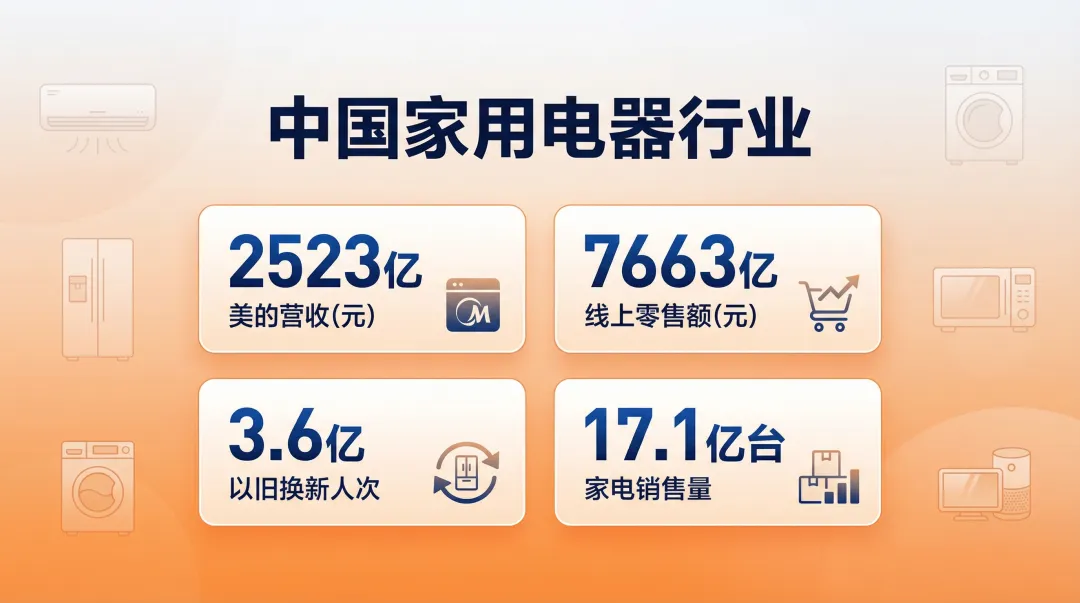 导读:2025年中国家用电器行业在内销国补托底、外销新兴市场强劲的双重驱动下,交出了亮眼的成绩单——三大白电巨头营收合计超5000亿元,美的以2523亿元营收稳居榜首,空调内销出货量创历史新高。线上家电零售额达7663.5亿元,以旧换新参与人次超3.6亿。2026年,AI家电、出海深化、绿色智能将成三大主线。