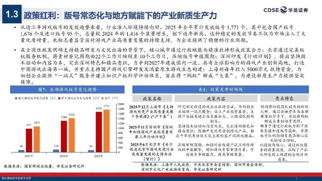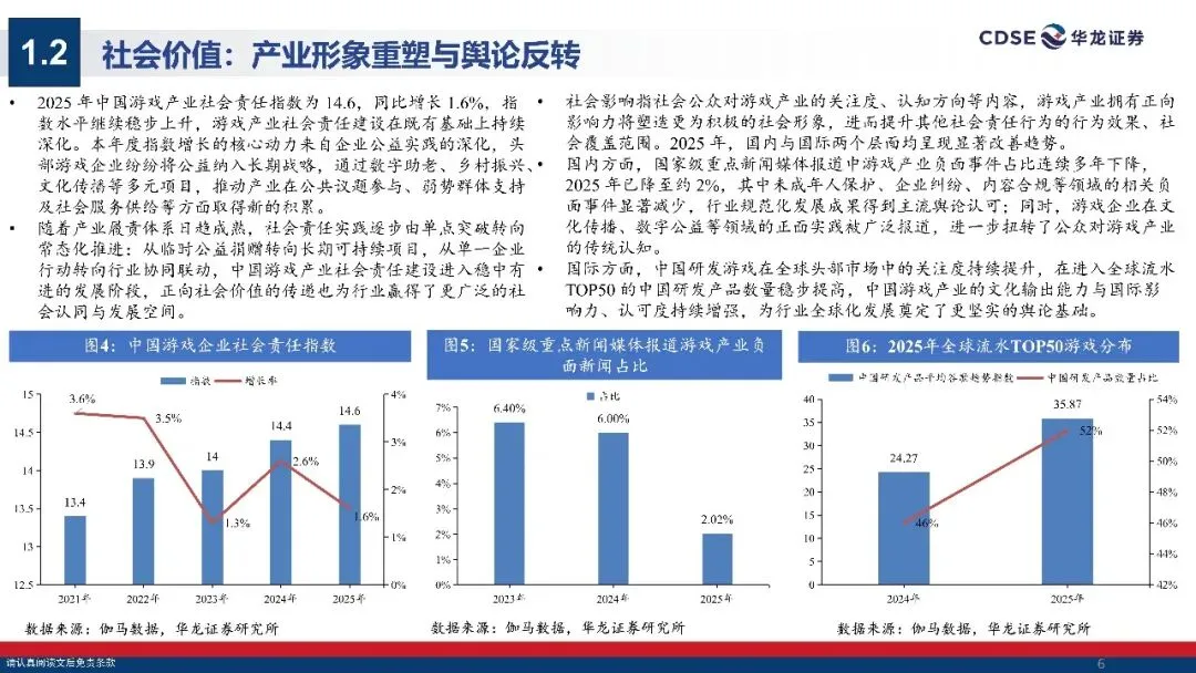游戏产业:政策护航与价值重构的高质量发展新周期:2025年中国游戏市场实际销售收入达3507.89亿元,同比增长7.68%,创下历史新高版号发放常态化、地方产业政策持续赋能,叠加社会责任形象象持续改善,为行业高质量发展莫定了坚实基础。同时,中国自研游戏出海规模达204.55亿美元,连续六年站稳千亿量级,成熟市场与新兴市场共同构成增长新引擎,行业整体景气度持续上行。