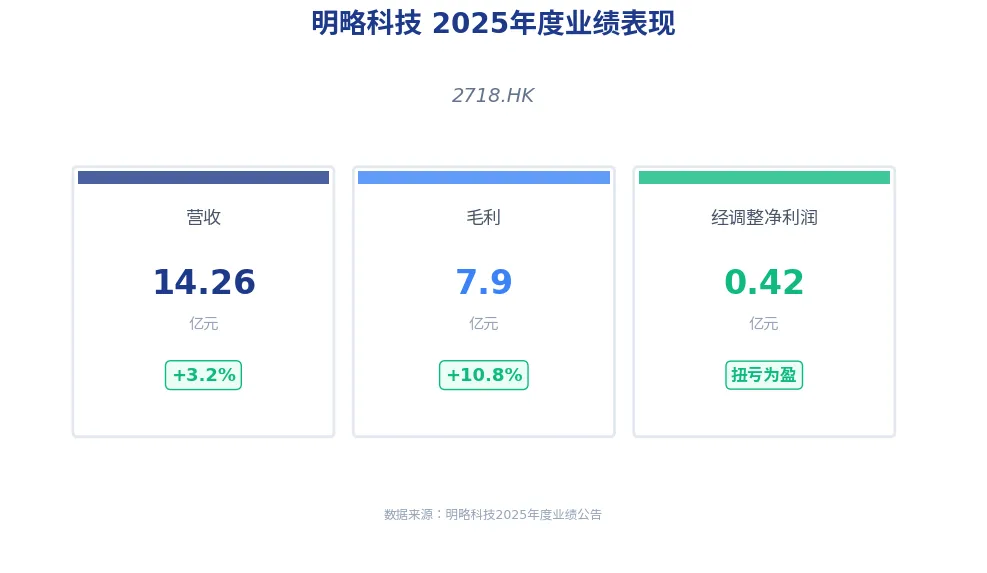 当然,看财报不能只看数字,要看趋势。明略科技(2718.HK)刚发了2025年成绩单:营收14.26亿,增长3.2%,毛利7.9亿,增长10.8%,经调整净利润扭亏为盈,赚了4200万。数据不错,但这只是皮毛。