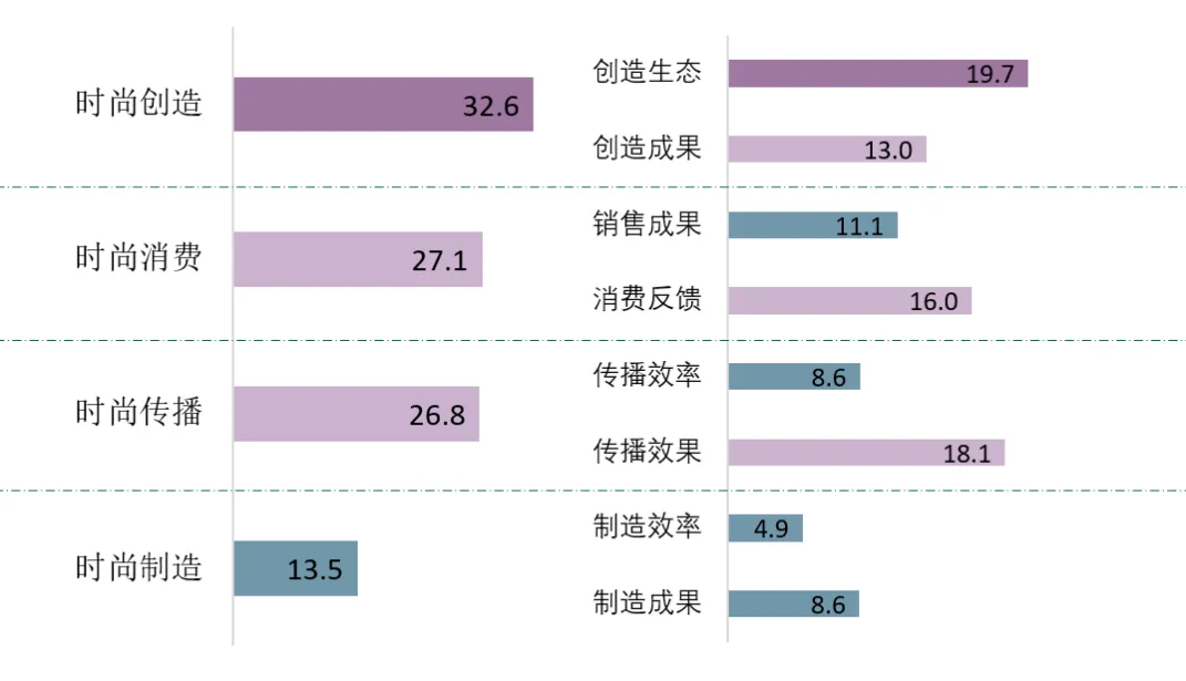 通过对近万条数据进行分析得出,在时尚创造、时尚消费、时尚传播、时尚制造四个一级指标中,时尚创造对产业时尚发展的影响力远高于其他三个指标,时尚消费与时尚传播影响力相当,分列第二、第三,时尚制造的影响力相对较低。
