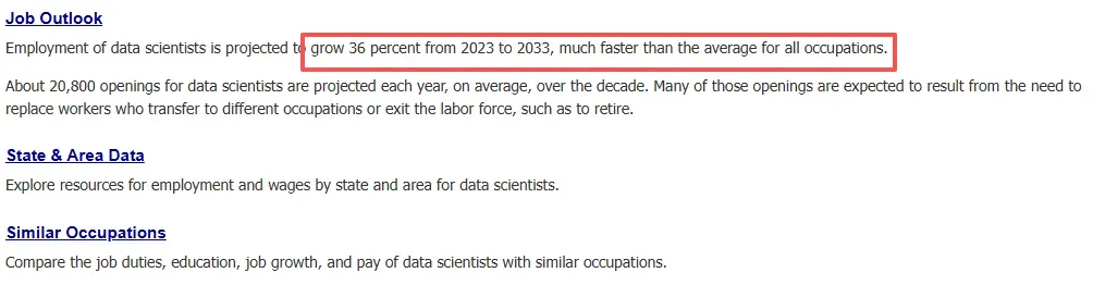 世界经济论坛的《未来就业报告》指出,AI与机器学习专家、商业智能分析师是增长最快的职位类型之一。美国劳工统计局预计,数据科学家岗位在2023-2033年将迎来34%的就业增长,远高于所有职业的平均水平,年均新增岗位约23,400个。