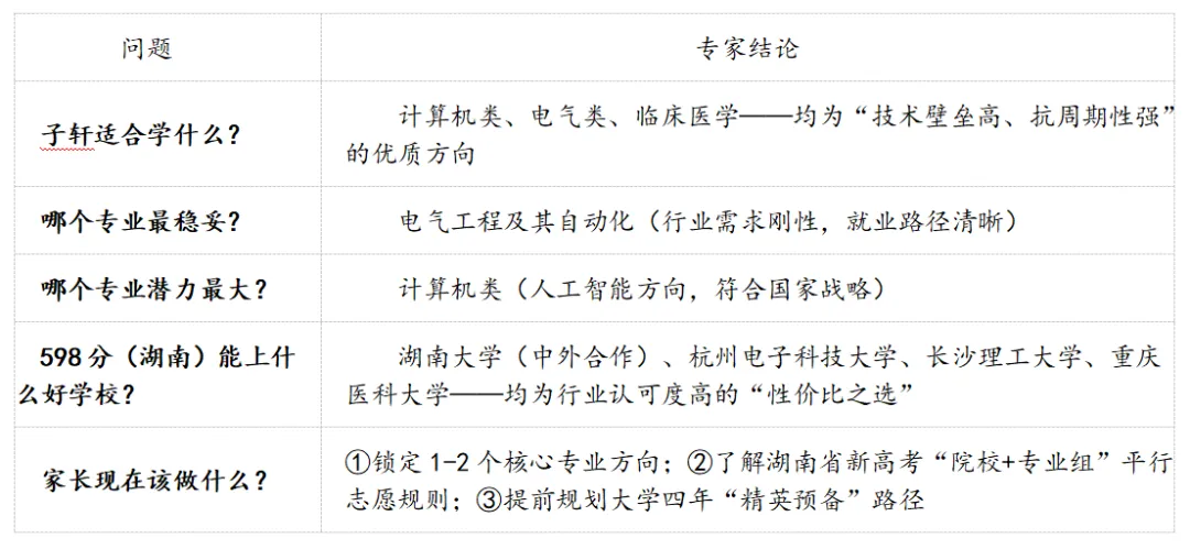 刘子轩同学,你的598分,是你过去十二年努力的勋章。作为湖南考生,你拥有独特的地域优势——长沙正崛起为中部地区的科技与产业高地,无论选择计算机、电气还是临床医学,都能在本地找到优质的就业出口。