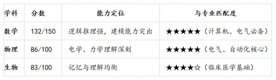 专家综合判断:子轩同学的数学成绩(122分)在同分段考生中处于中上水平,这为其学习计算机类专业的核心课程(算法、数据结构)奠定了良好基础。物理(86分)则是电气类专业的“入场券”。综合判断,子轩的最佳职业锚为 “技术专家型” ,建议优先锁定工科中“硬核、不可替代性强”的专业方向。