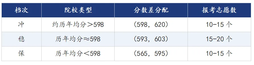 考生在填报志愿时,建议采取“冲—隐—保”三档次结构,通常分配原则如下: