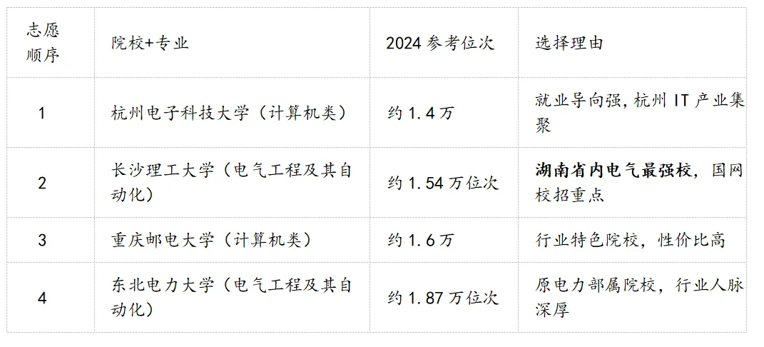位次波动风险:湖南省2025年高考人数预计增加约8%,热门专业(如计算机、电气)的录取位次可能上浮5%-10%。建议子轩在填报时将目标位次适当下调5%-8%,以确保稳妥。