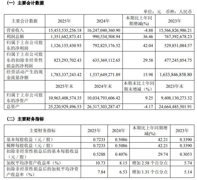 3月20日,卧龙电驱(股票代码:600580)披露2025年年度报告。报告期内公司实现营业收入154.54亿元,同比下降4.88%。实现归属于上市公司股东的净利润11.26亿元,同比增长42.04%。实现归属于上市公司股东的扣除非经常性损益的净利润8.23亿元,同比增长29.58%。基本每股收益为0.7233元。拟向全体股东按每10股派发现金红利1.8元。主要经营数据见下表。