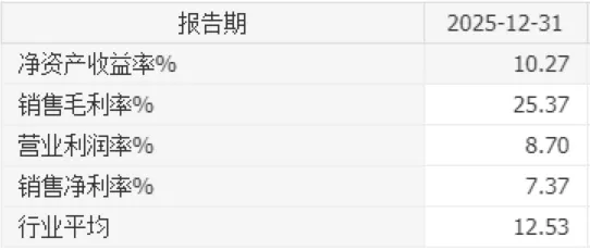 报告期内,该公司净资产收益率为10.27%,销售毛利率25.37%,营业利润率8.7%,销售净利率7.37%。行业平均是12.53%。