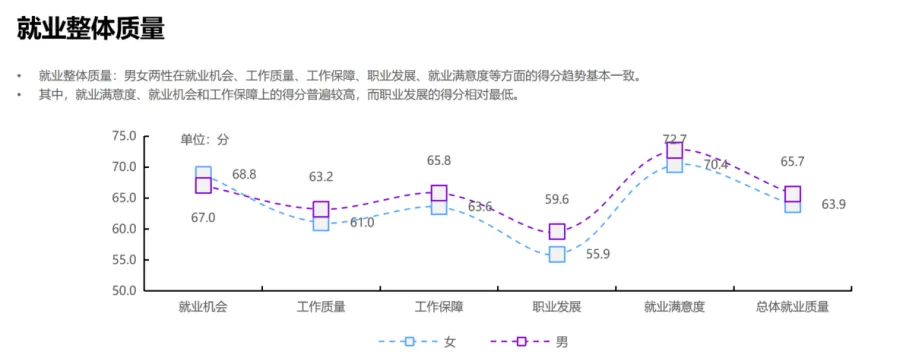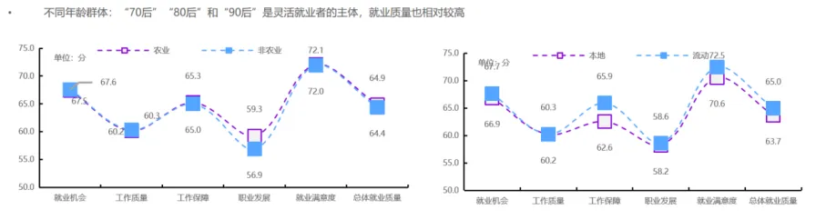 评估结果显示,灵活就业的总体质量得分为64.7分,处于中等偏上水平。此外,《报告》还进一步评估了不同业务类型、人群、产业/行业、所有制属性和地区之间的差异。分类比较结果显示,不同群体和类别之间的灵活就业质量存在明显差异。