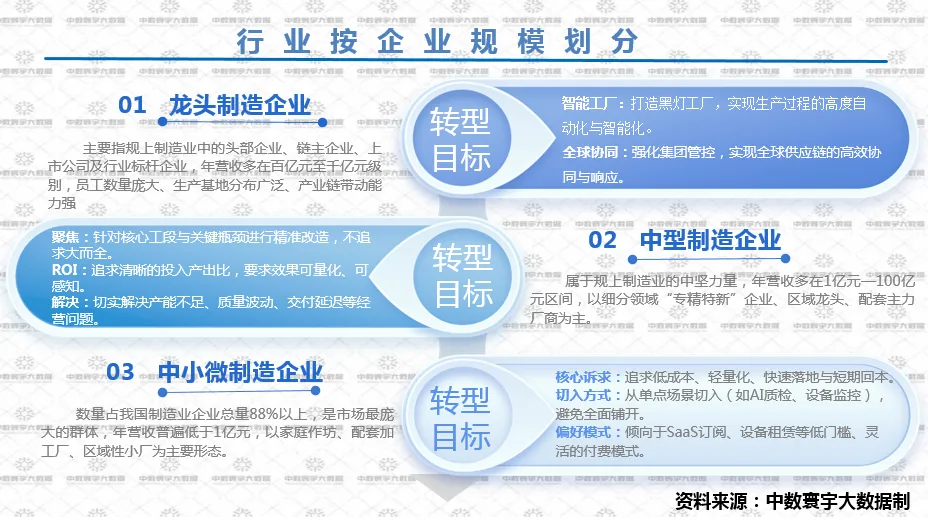 我国制造业企业按规模可划分为龙头、中型、中小微三大层级,形成需求差异显著的客群结构。龙头制造企业为规上头部、链主及上市公司,年营收百亿至千亿级,具备独立数字化团队与亿元级专项预算,聚焦集团管控、全球供应链协同与行业标准引领,重视技术自主可控与数据安全。中型制造企业以专精特新与区域龙头为主,年营收1亿—100亿元,拥有基础信息化与自动化布局,预算稳定、决策高效,以核心工段改造实现提质增效,追求高ROI与可量化成果。中小微制造企业数量占比超88%,年营收低于1亿元,普遍资金、IT与人才不足,转型以低成本、轻量化、快速落地为核心,优先通过单点场景改造解决用工、质检、设备监控等紧迫问题,对投入与回本周期高度敏感。