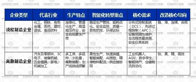 传统制造业智能化转型目标客群划,以生产流程特征分为流程制造企业与离散制造企业两大类型。流程制造企业以化工、钢铁、医药等为代表,生产呈现连续化、管道化、高温高压及安全合规要求严苛等特点,智能化转型聚焦稳定生产管控、能耗优化、安全监控与环保达标,核心需求为分布式控制系统(DCS)、先进过程控制(APC)等,改造以“稳、准、连续、合规”为导向。离散制造企业以汽车及零部件、3C电子、装备机械等为代表,生产呈现多工序、多品种、小批量、离散装配及换线频繁等特点,智能化转型聚焦柔性生产、快速换模、AI质检与供应链协同,核心需求为工业机器人、AGV、数字孪生等,改造以“快、柔、精、高效”为导向,两类客群需求场景高度分化、技术路径针对性极强,共同构成了传统制造业智能化转型的核心需求市场。