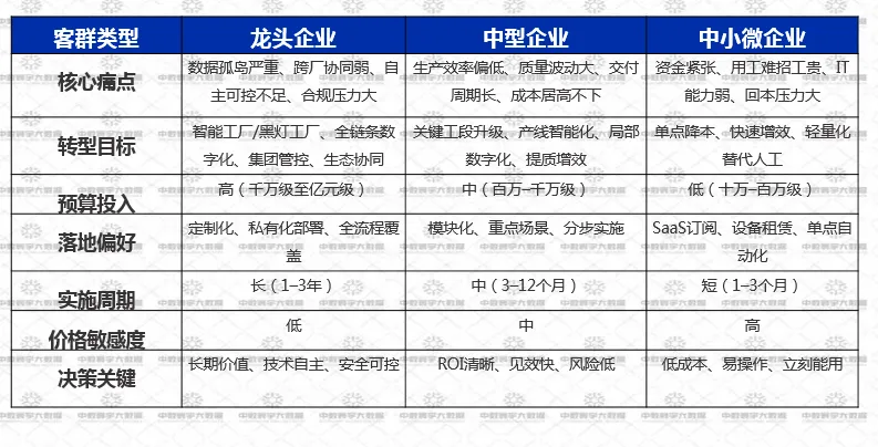 传统制造业智能化转型需求端呈现龙头企业、中型企业、中小微企业三层清晰分化的核心特征,龙头企业聚焦数据孤岛与自主可控痛点,以全链条数字化、智能工厂为目标,高预算、长周期,偏好定制化私有化部署,决策看重长期价值与技术自主可控;中型企业围绕效率、质量与成本痛点,聚焦关键工段升级与局部数字化,中等预算与周期,偏好模块化分步实施,决策核心为清晰ROI与快速见效。中小微企业受资金、用工与IT能力约束,以单点降本、轻量化替代人工为目标,低预算、短周期,偏好SaaS订阅与单点自动化,决策关注低成本、易操作与快速可用,三类客群共同构成了行业多层次、差异化的需求市场格局。