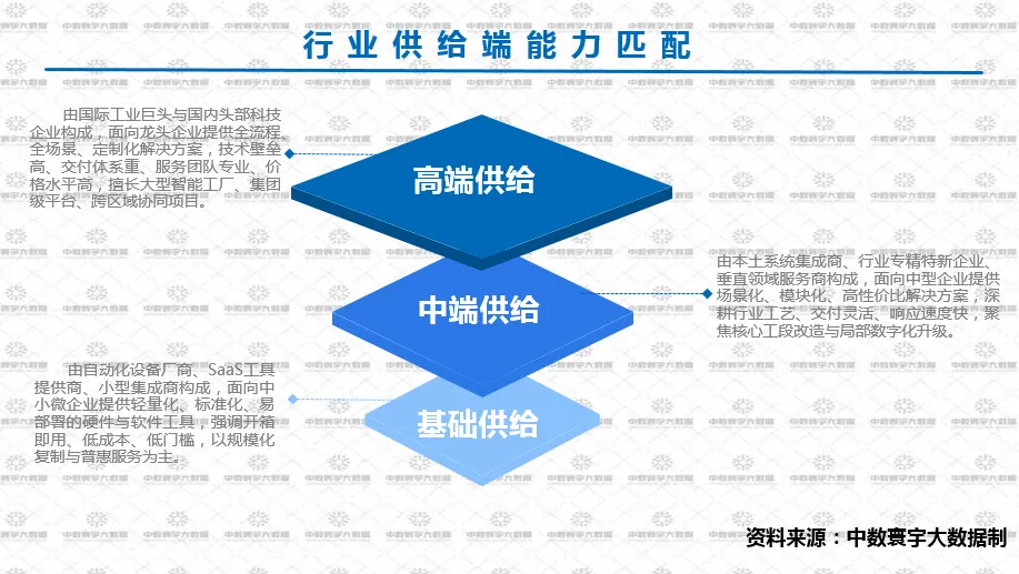 我国制造业智能化转型市场供给端呈现高端、中端、基础三级分层格局:高端供给由国际工业巨头与国内头部科技企业组成,面向龙头企业提供高壁垒、重交付、高价格的全流程定制化解决方案,主打大型智能工厂与集团级平台项目;中端供给以本土系统集成商、行业专精特新及垂直服务商为主,面向中型企业提供场景化、模块化、高性价比的方案,深耕行业工艺、交付灵活,聚焦核心工段与局部数字化升级;基础供给由自动化设备厂商、SaaS提供商与小型集成商构成,面向海量中小微企业提供轻量化、标准化、易部署、低成本的软硬件工具,以开箱即用、普惠化、规模化复制为核心模式。