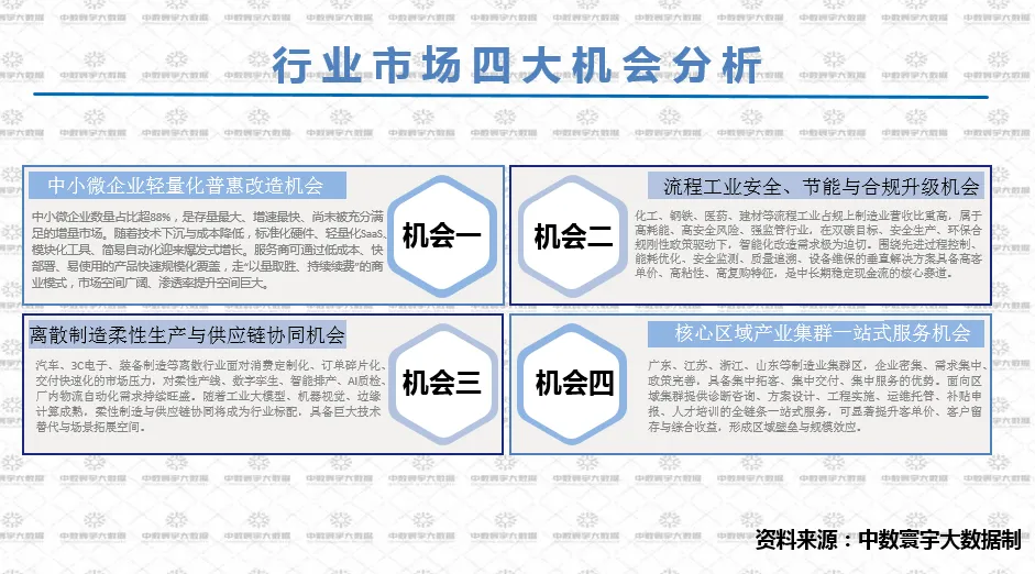 传统制造业智能化转型存在四大核心机会:一是中小微企业轻量化普惠改造,这类企业占比超88%,是未被充分满足的增量市场,可通过低成本、快部署的轻量化产品实现规模化覆盖。二是流程工业安全节能与合规升级,化工、钢铁等高耗能强监管行业在政策驱动下,对先进过程控制、安全监测等垂直解决方案需求迫切,具备高客单价与稳定现金流特征。三是离散制造柔性生产与供应链协同,汽车、3C电子等行业在定制化订单压力下,对柔性产线、数字孪生等需求旺盛,技术替代与场景拓展空间巨大。四是核心区域产业集群一站式服务,粤苏浙鲁等集群区需求集中,提供全链条服务可提升客单价与留存,形成区域壁垒。