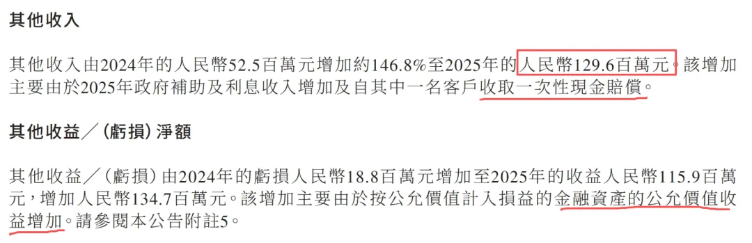 其中,2025年增加政府补助、客户收入现金补偿1.29亿。,金融资产收益增加1.34亿。