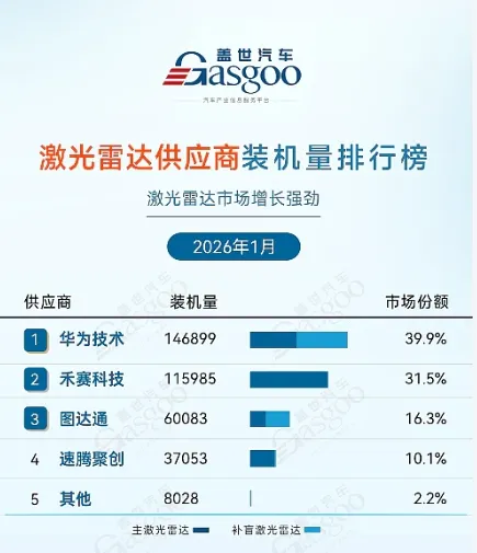 其次,在盖世汽车2026年1月的数据上,速腾激光雷达供应商装机量居然被图达通反超,市占率下滑到10.1%,速腾聚创对"市占率第一"的头衔有执念。