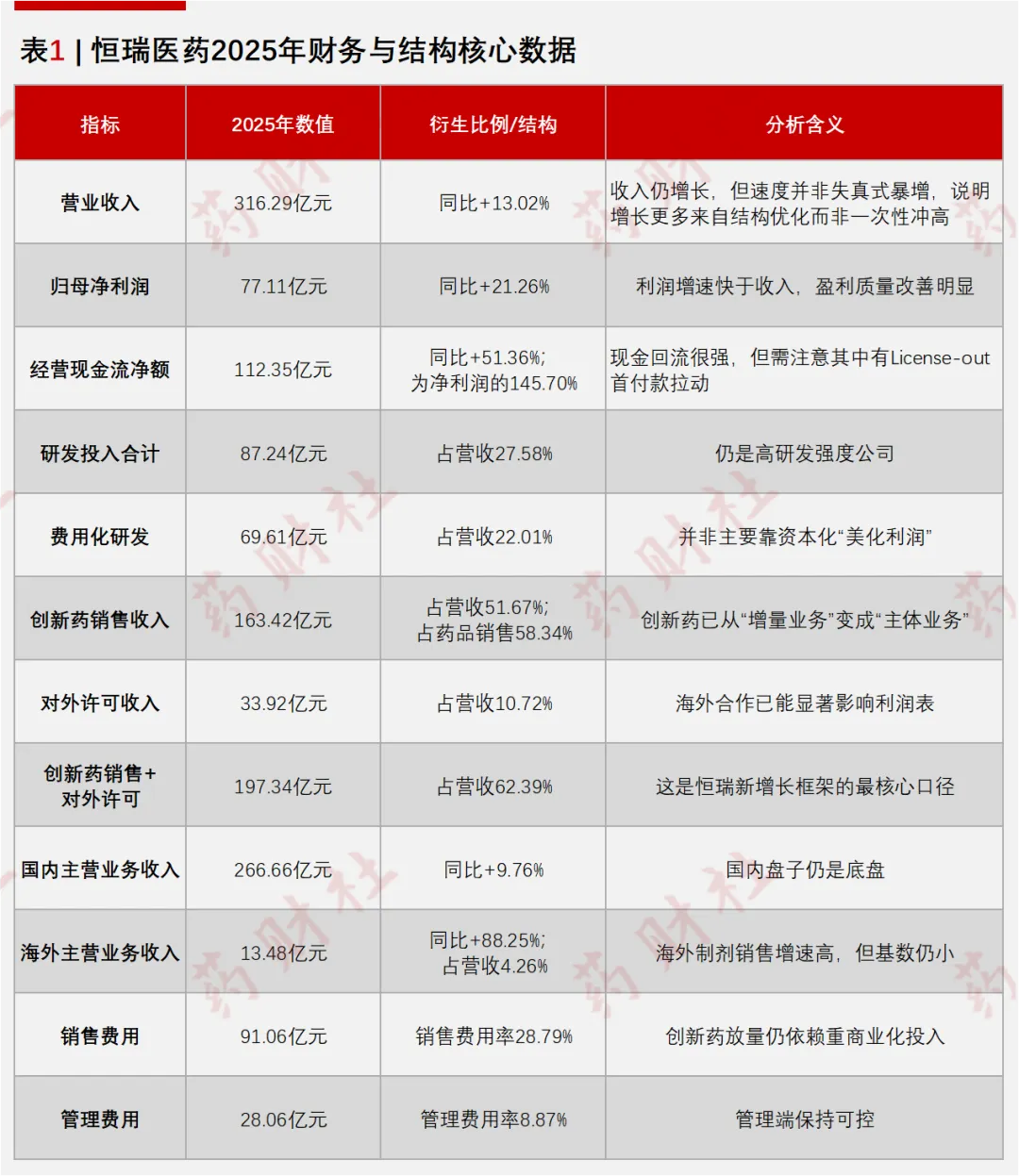 如果只看表面数字,恒瑞医药这份年报称得上是一张漂亮的成绩单:营收为316.29亿元,归母净利润达到了77.11亿元,经营现金流净额为112.35亿元,这3项指标都在上行,利润增速也明显快于收入增速。