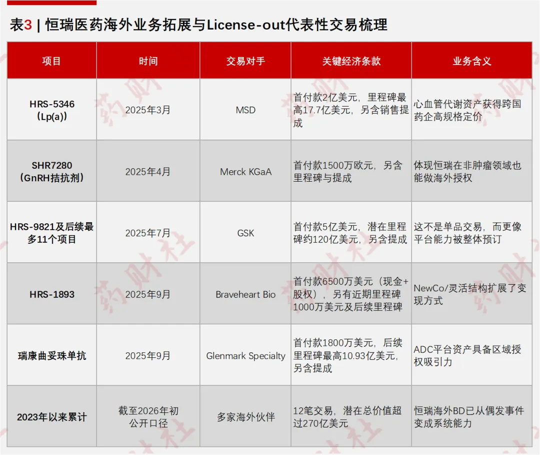 自2023年以来,公司已完成了12笔海外业务拓展交易,其模式涵盖对外许可、NewCo和战略联盟,潜在的总交易价值超过了270亿美元,这意味着恒瑞的国际化已经从偶发性事件,走向常态化经营。