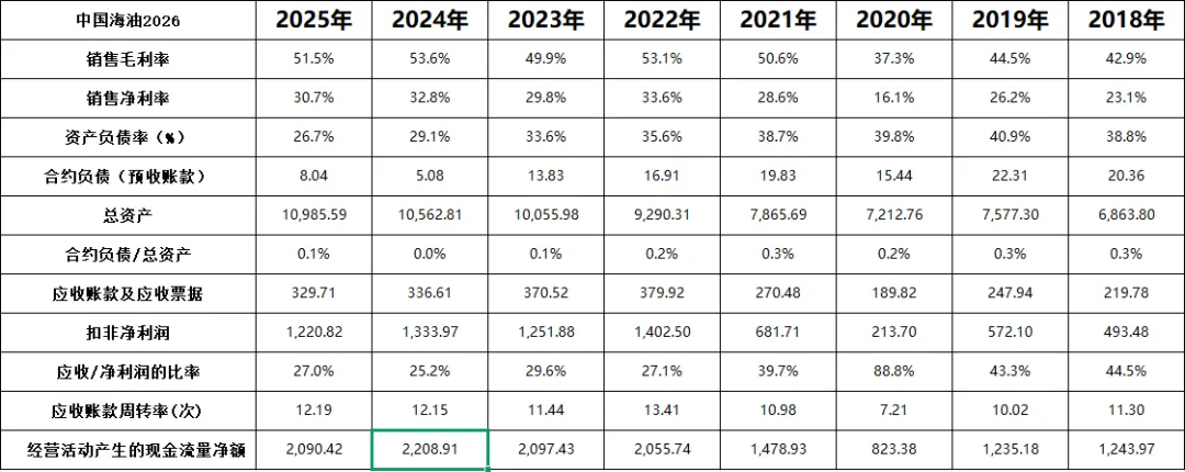 从这里我们可以看到,中国海油是一家高毛利率、净利率,低资产负债率,低应收账款率。