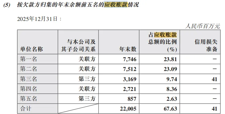 应收账款前5名的金额达到67.63%,而且有三家是关联方。这和我的猜想差不多,兄弟单位的因素很大。