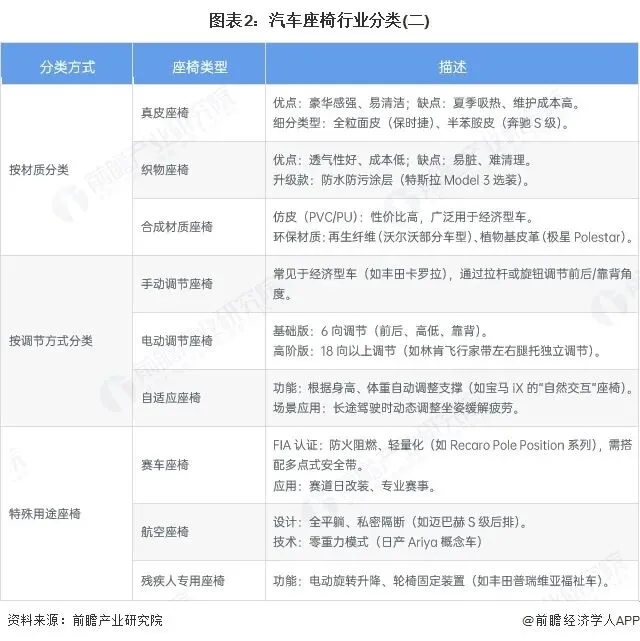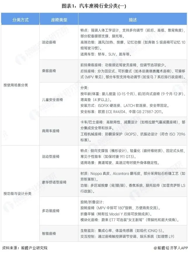 本文核心数据:中国汽车座椅行业市场规模;中国汽车座椅行业代表性企业产量汽车座椅是汽车内饰的核心部件之一,是供驾乘人员乘坐的装置,不仅要为驾乘者提供舒适的乘坐体验,还要在车辆行驶过程中保障驾乘者的安全。汽车座椅由座垫、靠背、侧背支撑、头枕等组成。它们具有一定的表面形状,座面和靠背的外形曲线应与人体放松状态下的背部曲线相吻合,乘员入座后座椅的表面形状与体压分布能使乘员的肌肉处于最放松的状态,能支撑到腰椎部位,不会因血液循环不良而引起肢体麻木,长时间乘坐不易感到疲劳。通过对座椅的前后上下、靠背的倾斜角度、头枕前后上下等位置的有限调节,可以使大部分人处于舒适状态。汽车座椅产业的上游主要包括原材料供应和零部件生产。原材料方面,钢材用于制作座椅骨架,提供强度支撑;塑料粒子可加工成座椅调节部件、装饰件等;海绵决定座椅坐感舒适度;皮革、织物或合成材料作为座椅表面覆盖材料,影响外观与触感。零部件生产涉及座椅骨架、调角器、滑轨等调节机构,以及头枕、扶手等附属部件,通常由不同专业供应商完成。