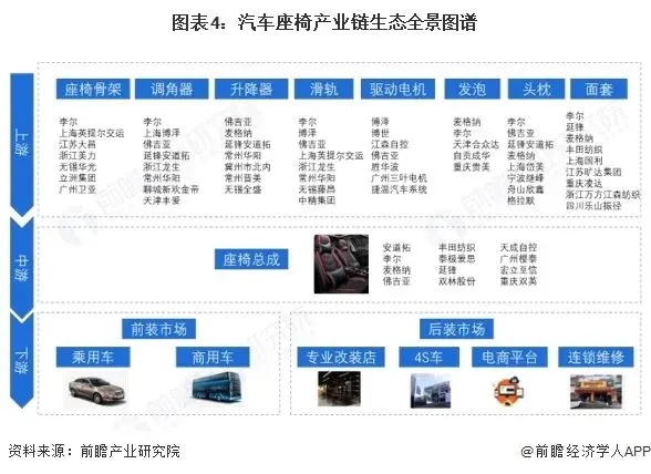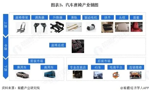 下游分为前装市场和后装市场,前装市场主要是各大汽车整车制造企业,负责将汽车座椅安装到对应的车型上;后装市场主要是涵盖座椅的售后维修、更换以及部分车主的个性化改装等需求。