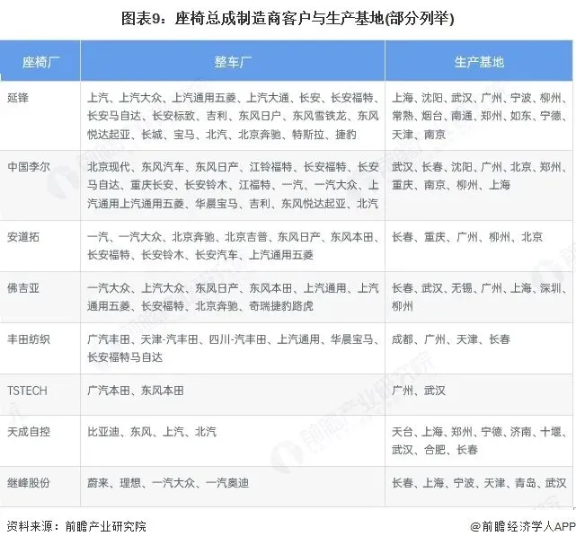 当前汽车座椅总成厂商有安道拓、李尔、麦格纳、佛吉亚、丰田纺织、泰极爱思、延锋、双林股份等等,部分座椅总成厂商覆盖上游座椅原材料及零部件制造,包括李尔、佛吉亚、麦格纳、延锋等等。下游汽车制造商覆盖品牌众多,如传统汽车集团广汽、一汽、上汽等,及新能源汽车品牌比亚迪、问界、小米、理想、蔚来等。