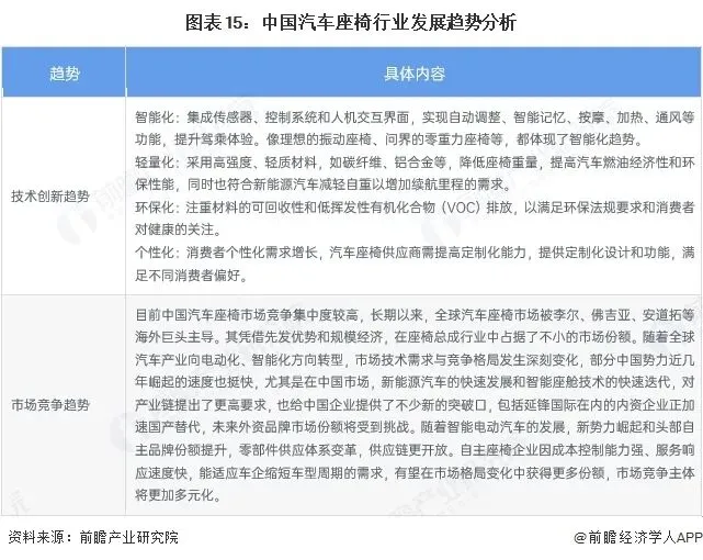 根据中国企业数据库企查猫,目前中国汽车座椅注册企业主要集中在浙江省,此外广东省、江苏省等也具有不少布局汽车座椅业务相关的企业。1、行业发展趋势分析